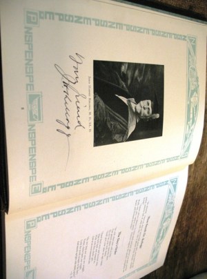 In amongst all the photographs, the one of Kellogg stands out. With a distinguished looking beard and mustache, he appears in full academic regalia and signs the book simply “Your friend J.H. Kellogg”. He is perhaps best known for his family affiliation and for the School of Normal Education that was part of The Battle Creek Sanitarium, which was fictionalized in the novel The Road to Wellville by T. Coraghessan Boyle in 1993, and later turned into a movie by the same name. However, he was also an accomplished surgeon and a gifted inventor with over 30 patents (including the electric blanket) and is believed to have developed some popular breakfast foods such as Granola, peanut butter, and corn flakes.
