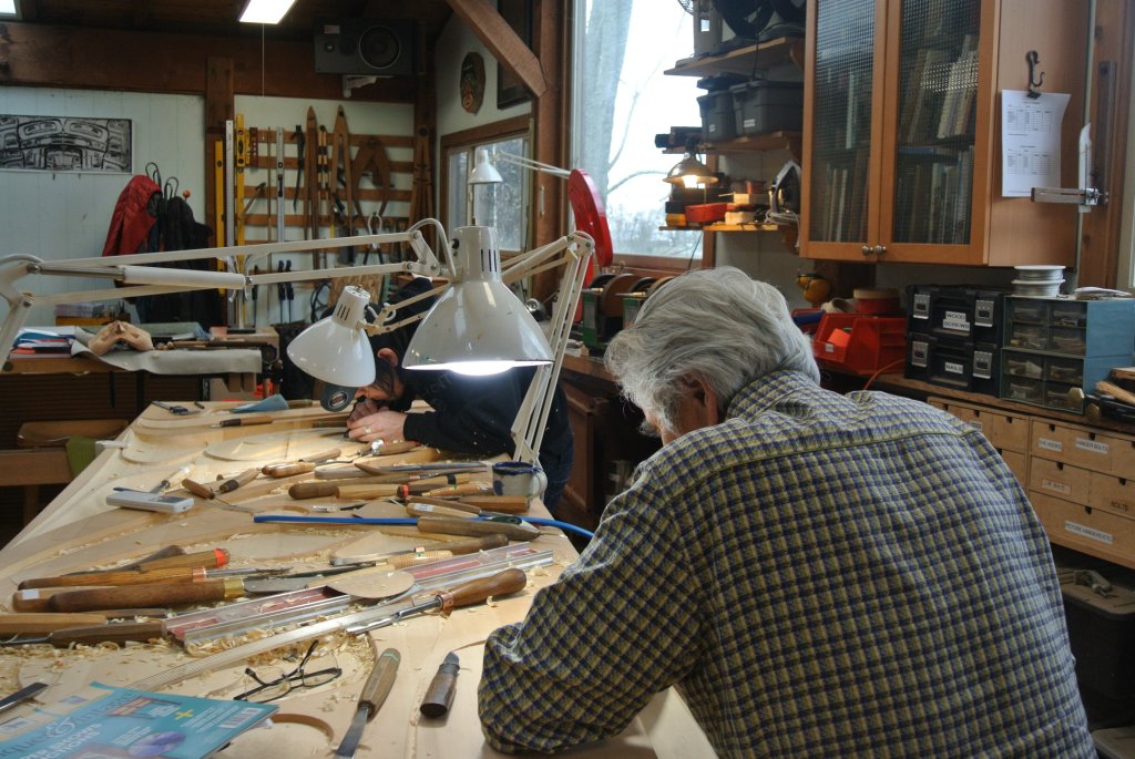 Surrounded by the tools of his trade in a rustic studio with massive windows that frame an idyllic image of the nearby forest, Robert Davidson’s studio is bright, cozy and inviting. However, it is also a place of work, busy with purposeful activity. Two young men are outside chopping wood and inside, Davidson along with his most recent apprentice, Nuxalk artist Sesyaz Saunders, are working side by side, heads down carving. Davidson is patient but direct, as he meticulously guides Saunders’ technique on the large cedar carving called “Supernatural Beings.”