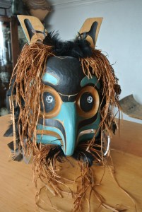 His grandparents were also instrumental to Davidson being able to take on a cultural project of this magnitude. “Naanii and Tsinii supported it through many meetings at their house,” says Davidson, “and after the meetings Tsinii would get out the drums and the songs would inspire different information coming out.” It was the first time that he had heard Haida singing. “I remember Naanii on one of the songs she got someone to hold a blanket out. There was no explanation, it was just acted out.” Part way through she stopped the song because she needed a mask and asked one of his cousins to get a brown paper bag. Davidson remembers her cutting out holes for the eyes, “That was my first experience with a Haida mask because at that time we didn’t have anything; we didn’t have any masks or anything. It had all be taken or lost.”