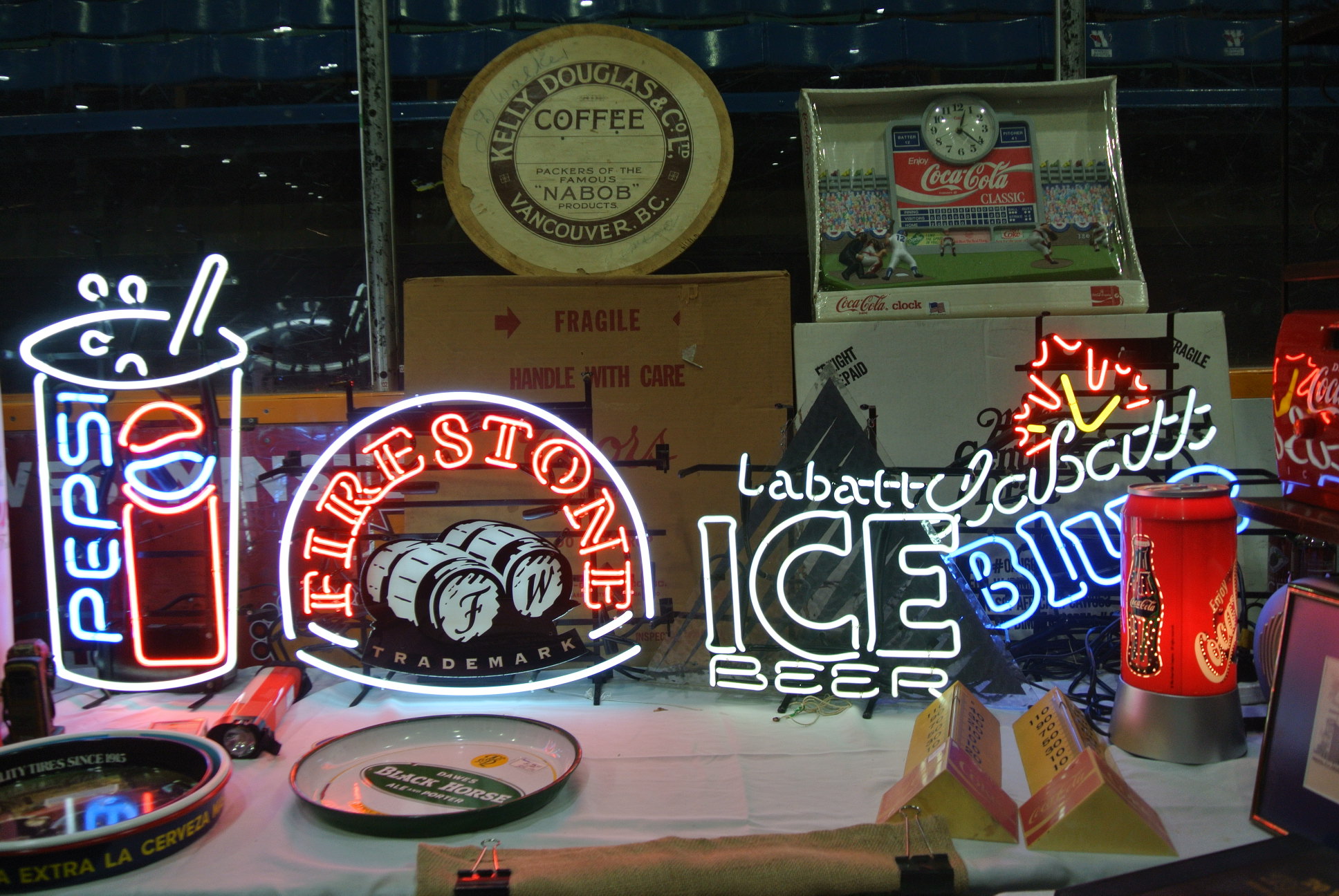 As well as clocks and bottles, Pat McNamara had a unique selection of neon advertising signs at his booth.