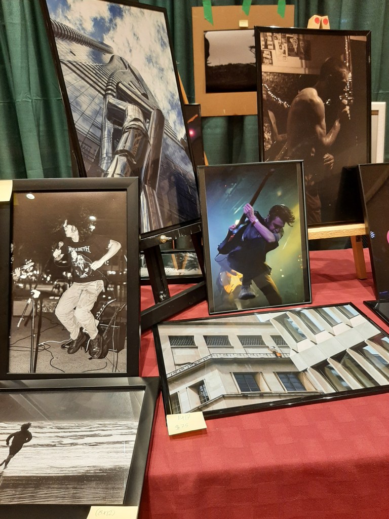With antique dealers set up in the main auditorium, the artists were grouped together in a smaller room just to the left of the main entrance. One of the artists who stood out was a young man with long curly black hair, wearing a white shirt with a black tie, standing in front of a series of photographs. Turns out this was Elizabeth McCallum’s son, Mungo Dulmage. Although only 19, he has already established himself as a sought after industrial and street photographer who specializes in taking photographs of the local underground music scene.