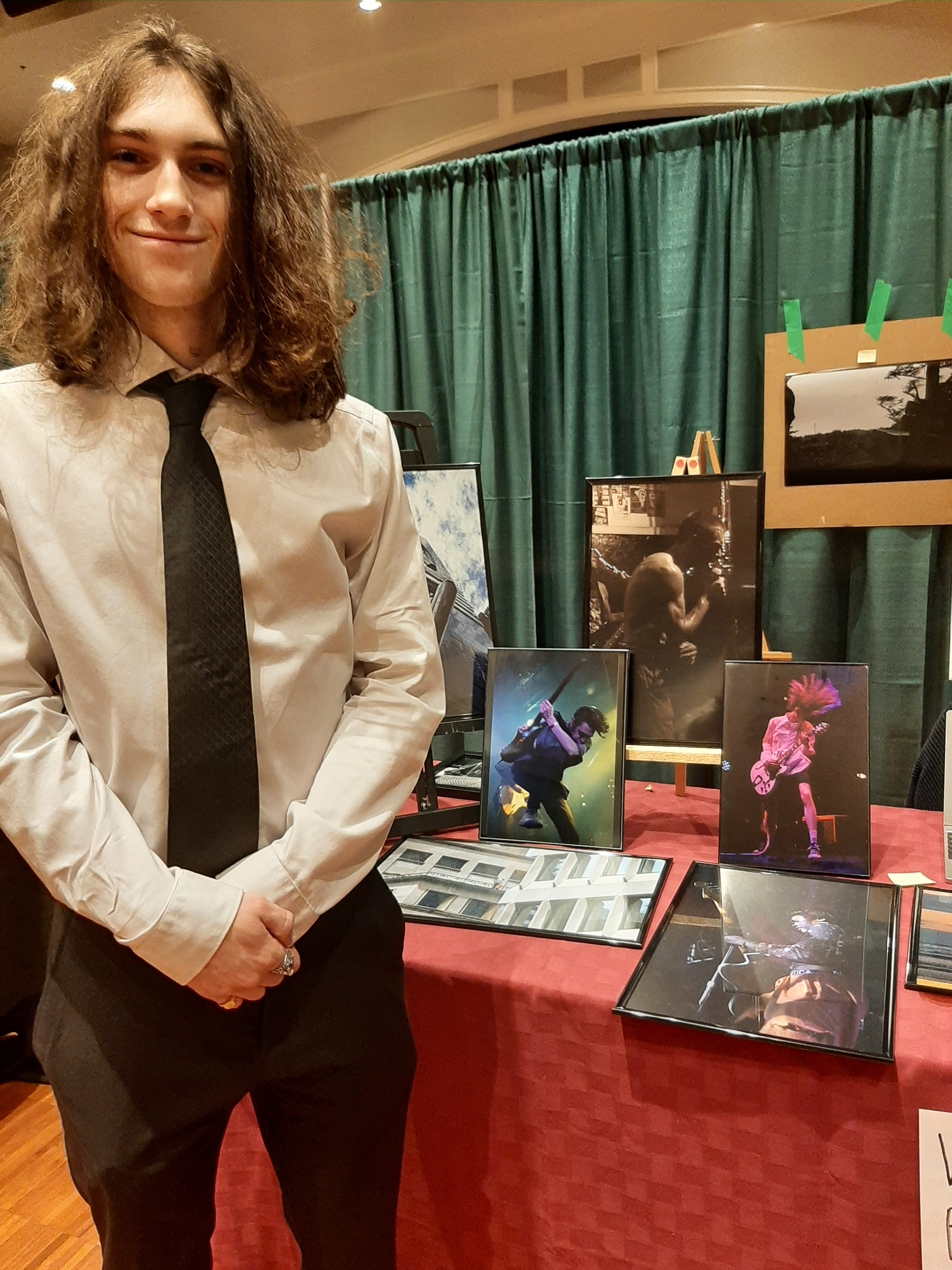 With antique dealers set up in the main auditorium, the artists were grouped together in a smaller room just to the left of the main entrance. One of the artists who stood out was a young man with long curly black hair, wearing a white shirt with a black tie, standing in front of a series of photographs. Turns out this was Elizabeth McCallum’s son, Mungo Dulmage. Although only 19, he has already established himself as a sought after industrial and street photographer who specializes in taking photographs of the local underground music scene.